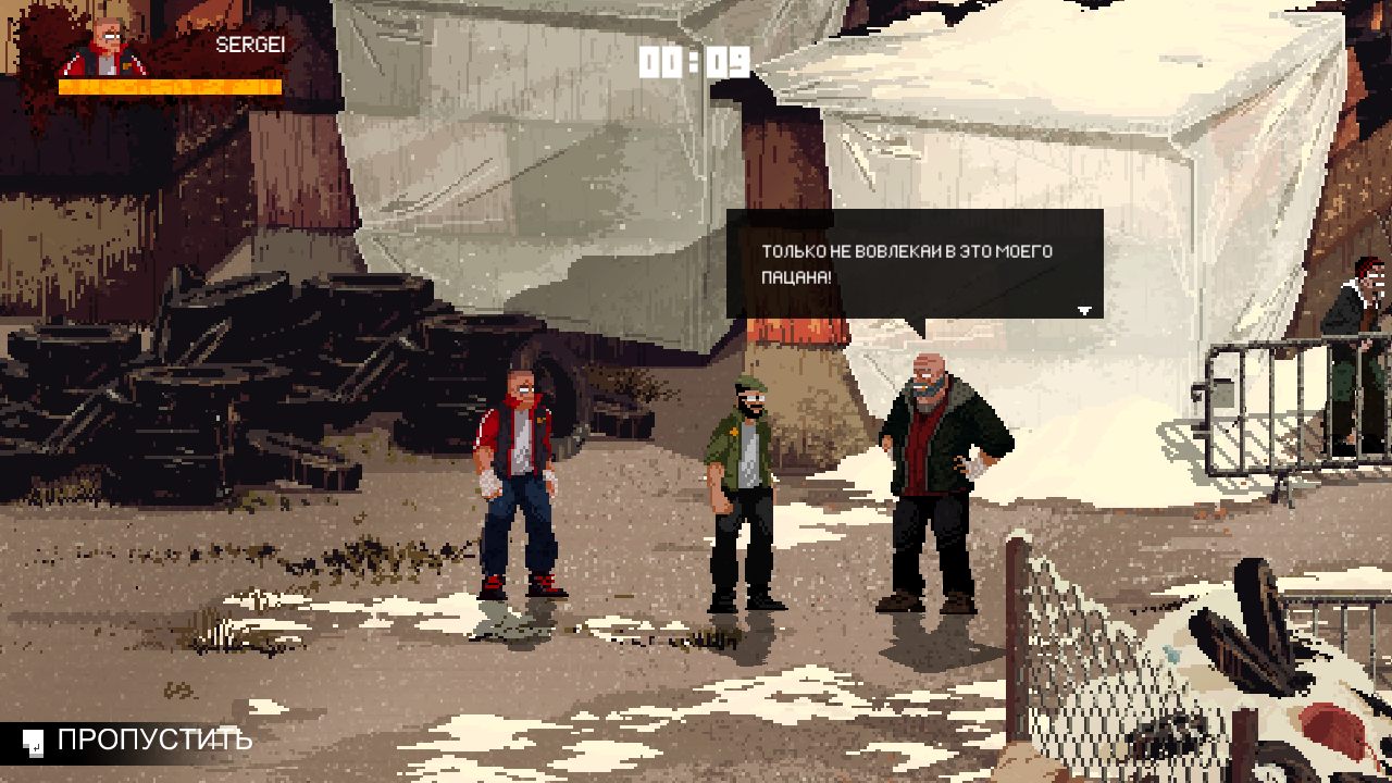 Mother Russia Bleeds – это простенькая аркада с очень необычным стилем и типом исполнения. Разработкой игры занималась компания Le Cartel, релиз состоялся в 2016 году. Перед нами типичный пиксельных инди-проект, который рассчитан на исключительно острые патриотические чувства и приступы любви к родине. Разработчики ничего нового не придумывали и взяли хорошо зарекомендовавший себя геймплей таких гигантов как Renegade, Double Dragon, Streets of Rage и так далее.