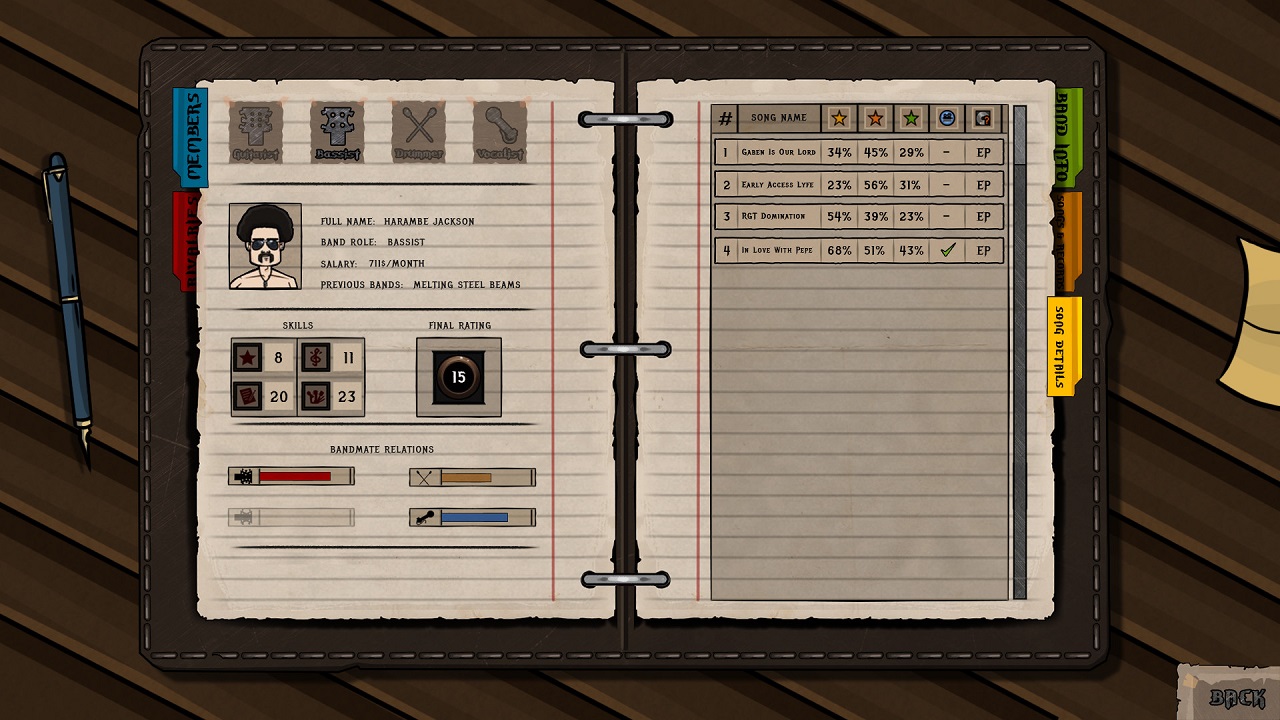 Rock God Tycoon - типичный музыкальный симулятор, в котором можно делать практически все, что угодно, но только в рамках дозволенного. Такая игра понравится всем музыкантам и начинающим исполнителям. Здесь вы даже можете записать собственную песню, только что сочинивши ее, набросав текст и мелодию, а затем пойти в студию и спеть. В самом начале игры вам придется выбрать главного персонажа, коим вы и будете являться всю оставшуюся часть игрового процесса. По сюжету, вы должны сколотить группу из ребят, которых вы выберите. Поначалу вам доступно несколько персонажей на выбор, а дальше, по мере развития сюжета, у вас появится возможность выбирать из большего круга юнитов. Выбирайте, на каком инструменте будете играть, либо же просто пойте и будьте настоящим фронтменом. Освойте гитару, бас, скрипку, укулеле, пианино или синтезатор, сядьте за барабаны или просто станьте возле микрофона и попадайте в ноты. Пишите тексты для группы и записывайтесь на самой лучшей студии в мире. Конечно, в начале игры у вас не будет на все это денег, придется довольствоваться, чем есть. Но, от этого и круто. Ведь вы будете развиваться и идти все дальше и дальше к своей мечте, проходя через тернии к звездам. Набирайте в свою группу различных ребят из разных субкультур, создав идеальную команду исполнителей и мастеров своего дела. Если кто-то бездельничает или лениться, смело увольняйте его и берите нового участника коллектива. Здесь нет места пощаде и снисходительного отношения. Вы - лидер группы. Как участники относятся к вам, так и вы относитесь к ним. Станьте лучшей группой в жанре рок и выступайте на самых больших мировых аренах.