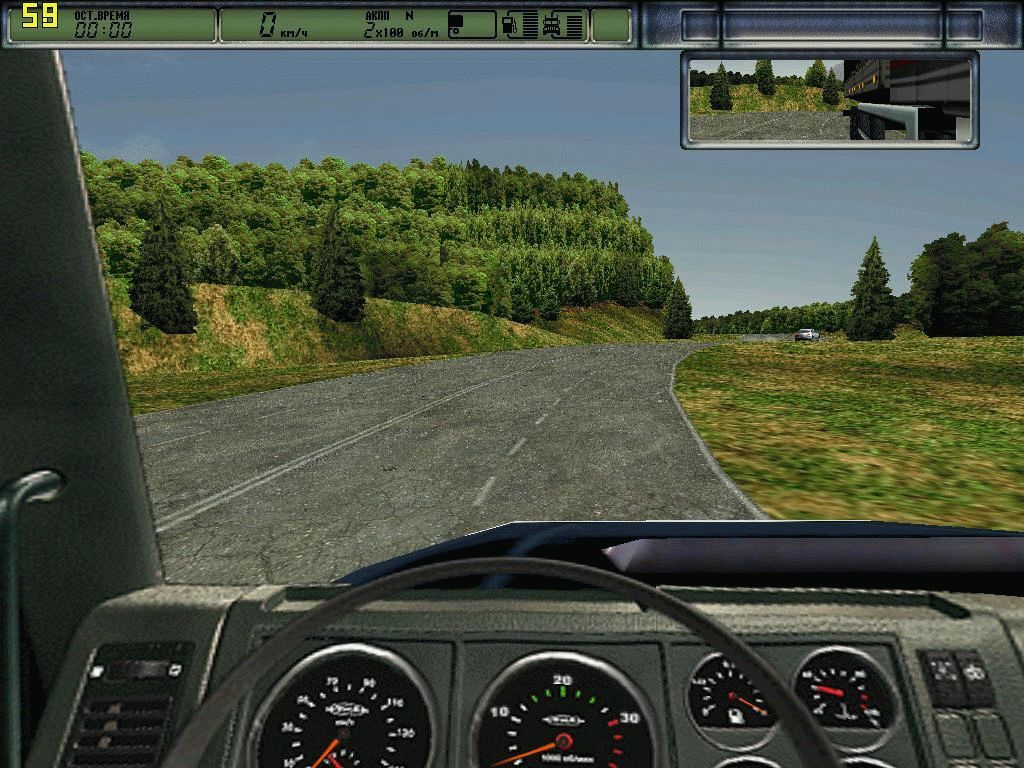 Игрушка очень старенькая, год выпуска 1998, так что графика чем-то напоминает первые версии Doom’а. Не смотря на это, тут есть отображение зеркала заднего вида и тряска машины, когда она наезжает на препятствия. Все авто довольно неплохо качаются на большой скорости, а на холмике грузовик может даже подбросить а то и перевернуть. Очень важная часть – это атмосфера вождения, именно она запала в души фанатов и поселила любовь ко всем играм серии. Мерно покачивающая машина выглядит действительно живой, крутящийся руль и уходящие куда-то вдаль полоски дорожной разметки погружают в мир спокойной и размеренной езды.
