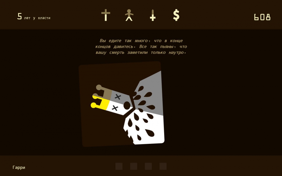 Историю вам придется создавать самим. Все ваше королевство имеет четыре основных составляющих, с которыми придется считать, это сам народ, армия, церковь и деньги. Как вы уже поняли, вам будут выпадать карточки с событиями, а вы решаете, что сделать в данной ситуации. Каждый вариант ответа влияет на одну из сторон королевства. Например, священник пишет вам предложение повысить налоги на церковь, а вам обязуется отдать долю. Не трудно понять, что в данной ситуации ущемляются обычные люди, за то отношения с церковью улучшаются, а казна растет. Иногда вам будет предложен сбор крестового похода на неверных с целью их скорейшего уничтожения. В таком случае ваш народ начнет потихоньку вымирать, нужно заботиться, чтобы в королевстве остались люди.