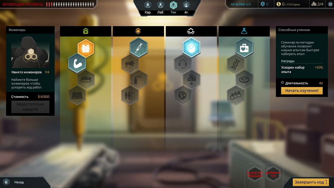 - Развивайте новейшие технологии. Вы можете открывать новые возможности в дереве технологий. Благодаря этому модифицируйте стратегию борьбы с болезнью, подстроив её под свой стиль игры.