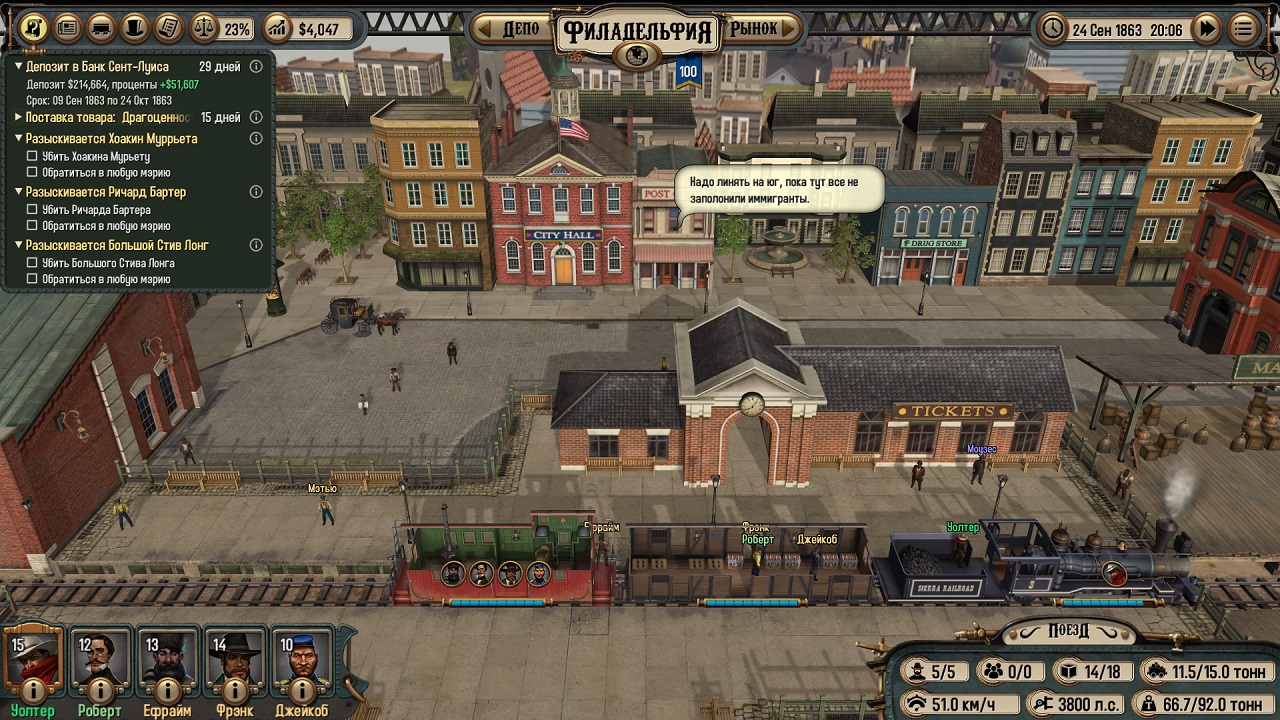 Каждый рабочий имеет три перка – механик, стрелок и канонир. Прокачивайте навыки и бандиты перестанут быть проблемой. В любом городе вы найдете мэрию, где глава города может дать вам задание. Всего в поселениях три активных зданиях, еще есть рынок, на нем покупаются разные ресурсы, кстати, уголь понадобиться в качестве топлива, а также депо, тут можно купить улучшения своего поезда, отремонтировать его и приобрести новые вагоны.
