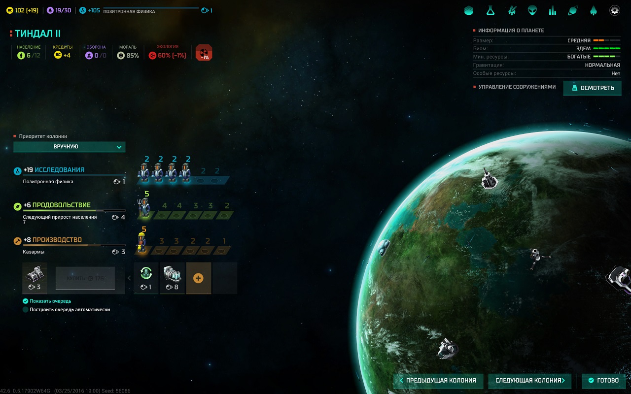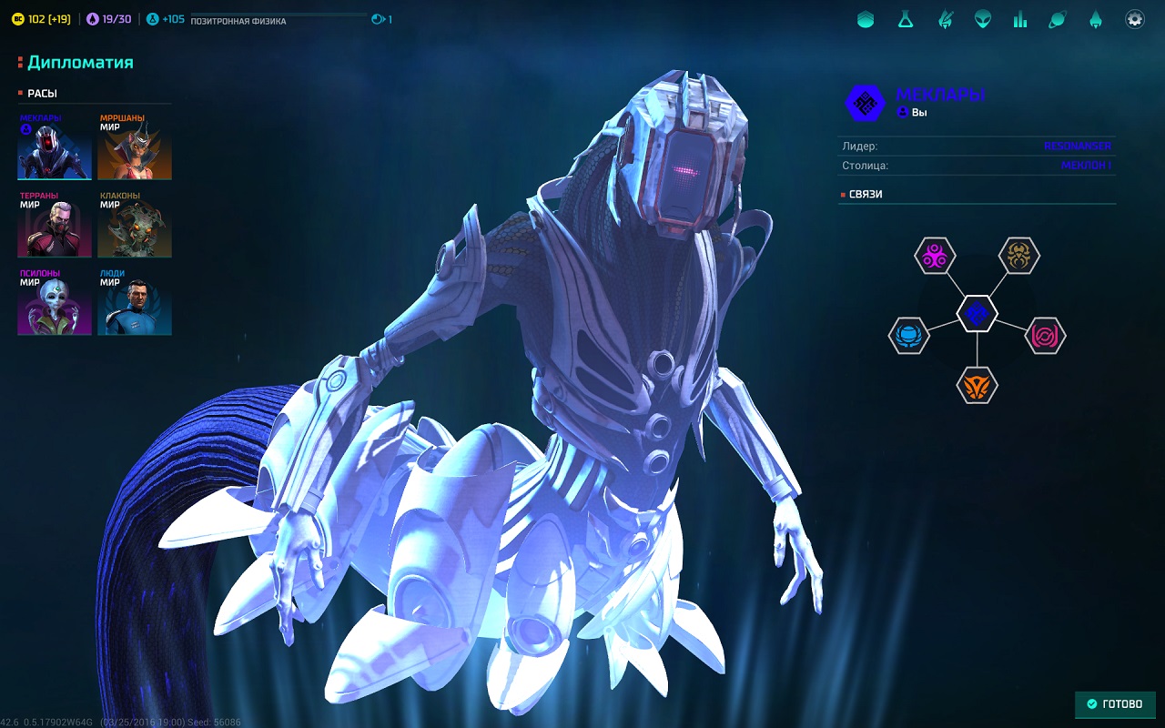 Огромнейшим плюсом игры можно назвать полную локализацию, даже описание каждой фракции переведено на русский. Имеется ввиду, что во время выбора игровой расы, диктор прочитает вам все особенности каждого представителя. Всего вам представлено на выбор десяток разных фракций, каждая из которых обладает уникальными бонусами и совершенно непохожим на других подходом к ведению дел. Следует выбирать их с умом, так как ваш стиль игры будет напрямую зависеть от того, какую фракцию вы выбрали. Если вы хотите играть за ученых, то лезть с первых ходов в войну не стоит, они будут не довольны вашим решением. То же вас ждет и в обратном случае, милитаристы хотят войны, а не мирного развития.
