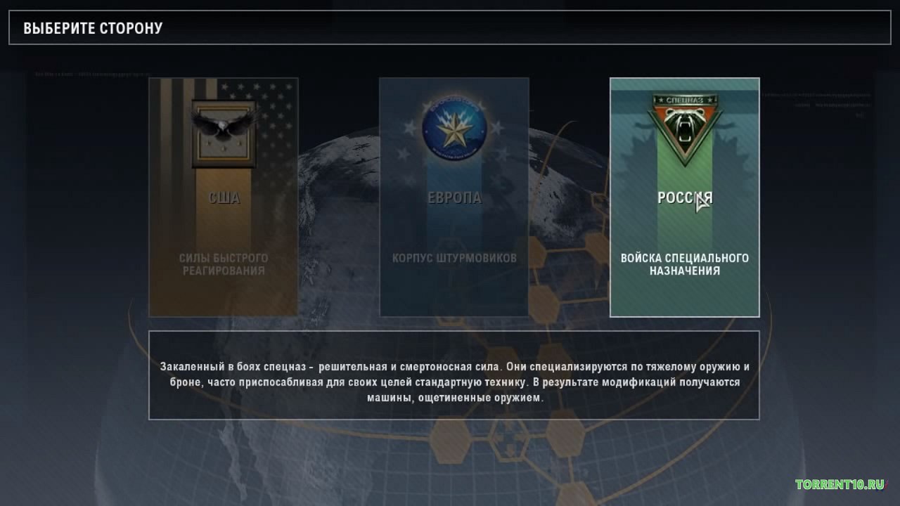 Всего игра рассчитана на 3 воюющие державы: Россию, США и Европу. Но, есть и еще одна, не играбельная - террористы. У всех государств есть одинаковые юниты, без каких-либо уникальностей и эффектных способностей. Это и стрелки, и снайпера, и инженеры, боевые роботы, обычная пехота и тд. То, как вы с ними разберетесь и научитесь играть - определит ваш успех в финальном сражении. Причем важно иметь в своей армии все 7 классов юнитов, ведь все они важны, особенно, если бьются в команде и действуют сообща. Также вы можете использовать дополнительные навыки, а это и суперудары, и магнитные импульсы, и дополнительная армия пехоты, авиаатаки и тд. Также, каждого бойца можно улучшить, тренируя его в казарме или лагере. Чтобы получать дополнительные пункты опыта и деньги, необходимо улучшать узлы связи и союзничать с многими государствами, либо захватывать их и превращать в свои. Так и появляются спецвозможности, которые пригодятся вам в любом сражении.